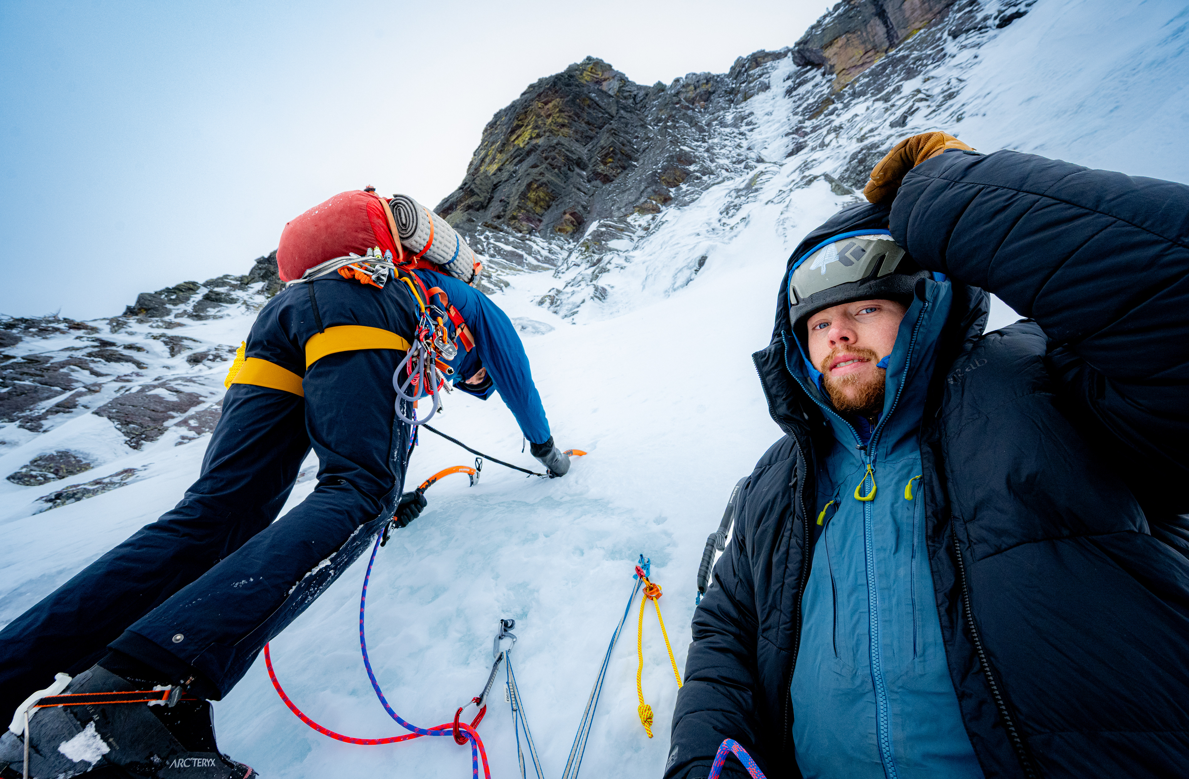 Surveying the countless snow gullies scattered along the headwall, we decided our safest option would be to climb on the sheltered face towering above the east side of the lake. We cached our skis below a large snow apron and began cramponing up the snowfield, aiming for a large overhang. From there, our neon-pink rope made its first appearance, and we tied in below a cave of vibrant red rocks sporting bright yellow lichen.