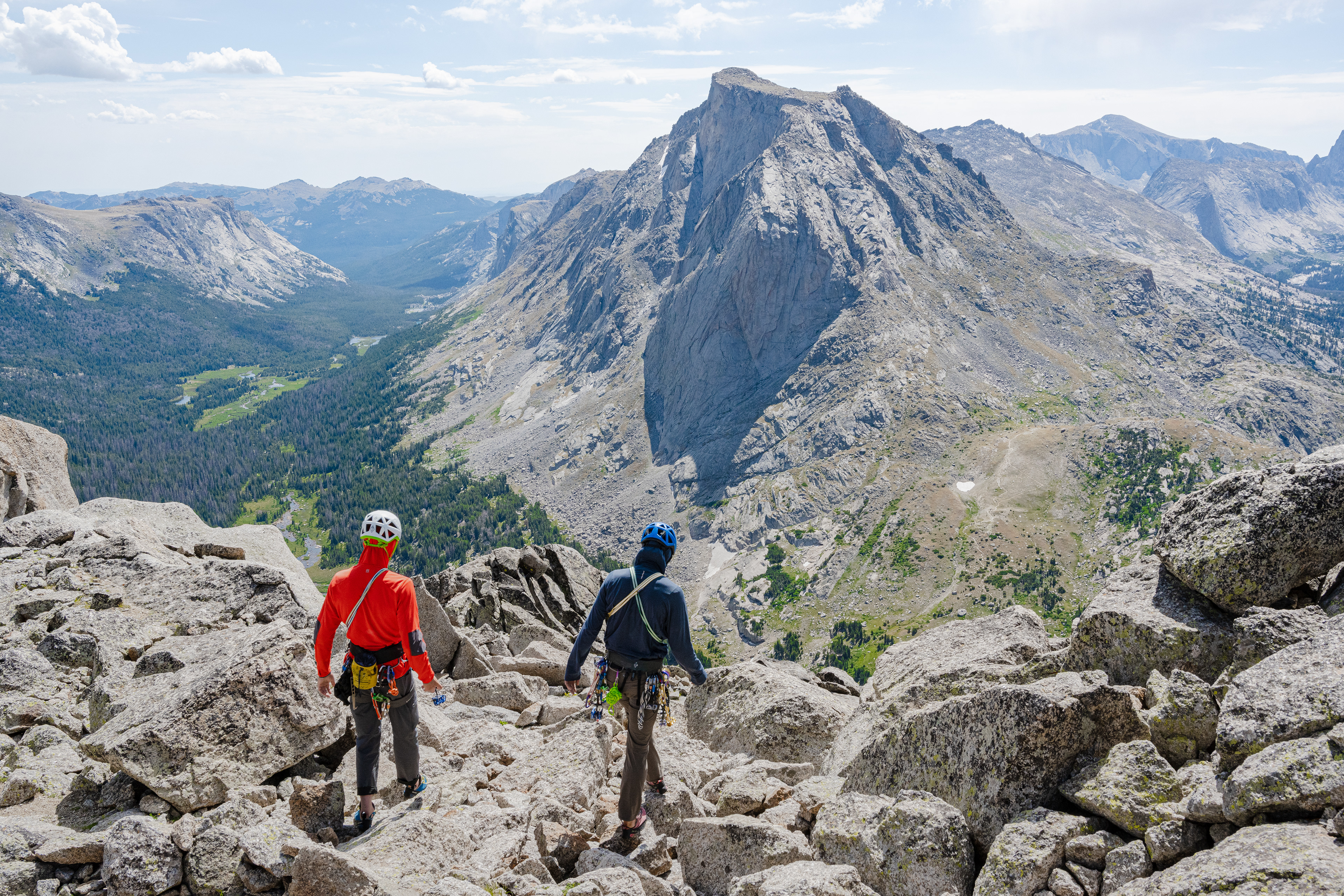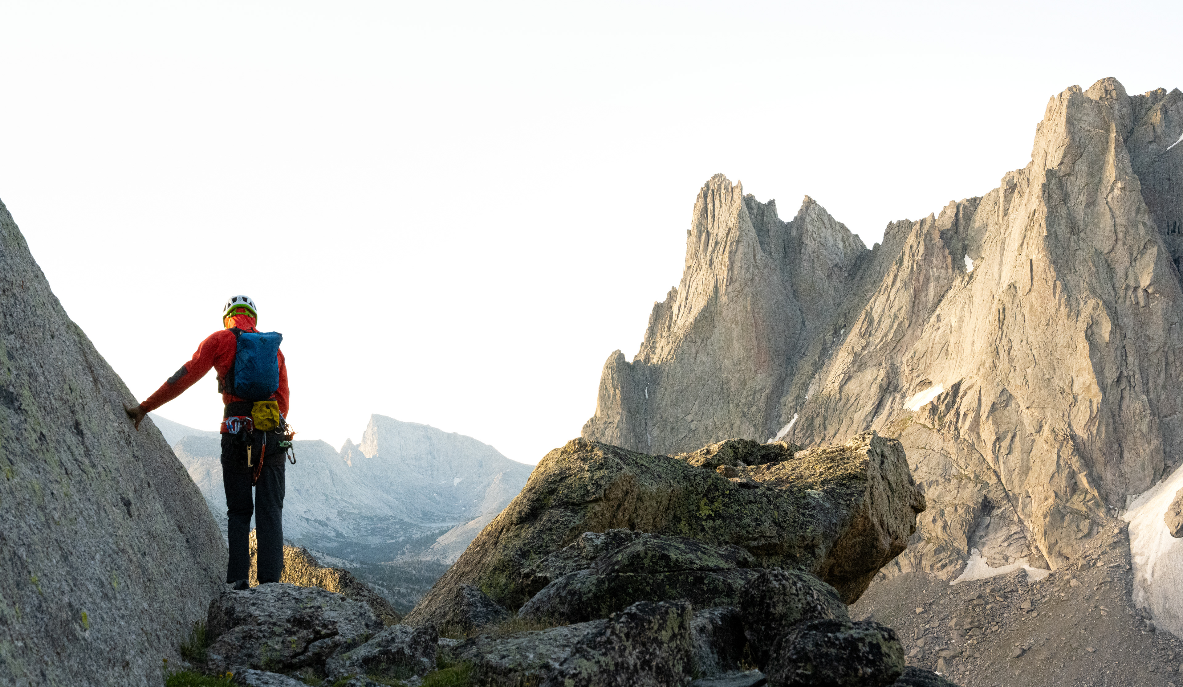 Awakened by a cool breath of wind grazing past my face, I took in the scenery and blinked continuously until the outlines of the Cirques summits stood clear, standing above me. Our objective was the Wolf's Head, lying at the north end of the Cirque, guarded by a broken ridge line that would entail multiple “no fall” scenarios. The route was home to many dangerous points  that would result in serious consequences if a mistake were to occur. We began moving through the morning dew to reach the base of Tiger Tower, a pit stop on the way to the Wolfs Head, we began our scramble up a western facing gully dividing Pingora and Tiger Tower. Loose rock and exposure woke us up immediately as I found myself traversing across a extremely exposed slab with no hand or feet holds, relying only on the friction of my hiking shoes and the rock, imminent death sitting at bay below me as the mountain face would likely claim me if a fall would occur. Moving through the hairy section we regained the gully, picking and choosing our route carefully as we traversed the face and reached the summit of Tiger Tower as the sun began to ignite the ridge line of Wolfs Head. Rappelling off Tiger tower and following the connected ridgeline we racked up and switched to the climbing shoes before climbing the majestic vertical shooting ridgeline. To gain the base of the mountain, a pizza-box-wide ramp at 30 degrees must be passed, nothing but exposure on each of our sides while crossing (the ground sat 1,000’+ below).  Rhythmic breathing took hold as the ramp was passed. Pitch one and two gained the large NE ridgeline as we moved through two beautiful crack systems to reach the top of the ridge line and the real climb–Maneuvering up, over, and through the massive granite tower blocks between us and the Summit of Wolfs Head. Exposed climbing would be an understatement to describe this route, as we found ourselves on many delicate hand and foot traverses along the ridge. Pitch three was an exposed down climb to a ledge that would lead to a massive offwidthy’ break in the mountain, only pleasant if you were skinny! - As sideways was the only way you could even think of fitting through the route, as I grunted through the claustrophobic crack in the granite, I began feeling as if I was rebirthed by the earth once I was crawling out of the tight squeeze. The next three pitches were the best varied climbing terrain an adventurer could dream of. Starting with a crack spanning 50’ across a blank face with no hand holds, only a toe-deep crack that you must shimmy across, depending only on the tips of your toes.  Halfway across the line in the granite I felt the intense exposure of the vertical face above and below me but didn’t dare look down. Instead I inched my way across the face and reached the ledge leading to the next pitch. The pitch started with a unique layback against a crack, followed by the opposite of the previous pitch-a hand traverse with no footholds, moving around a bulge in the ridgeline (with the same amount of exposure). With all the hard climbing behind us we took in the less-seen views of the completely vertical north side of wolfs head as we led a final ledged traverse pitch. The “crown” of a summit block was the final scramble to the incredible summit of Wolfs Head, standing proudly at 12,165 Feet. Sitting atop its windy summit with only jaw dropping views to occupy our minds as we sat in silence. A sense of clarity is felt atop a beautiful summit, carrying the feelings of appreciation to have been lucky enough to have rejoiced atop such a spectacular high point.